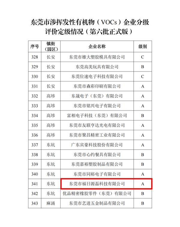 近日,東莞市生態(tài)環(huán)境局公布第六批涉揮發(fā)性有機(jī)物(VOCs)企業(yè)分級(jí)評(píng)價(jià)結(jié)果。福日電子成員企業(yè)源磊科技憑借規(guī)范完備的治理體系與持續(xù)向好的環(huán)保成效,成功獲評(píng)最高等級(jí)——A級(jí)企業(yè),環(huán)境管理能力躋身行業(yè)與區(qū)域的標(biāo)桿行列。